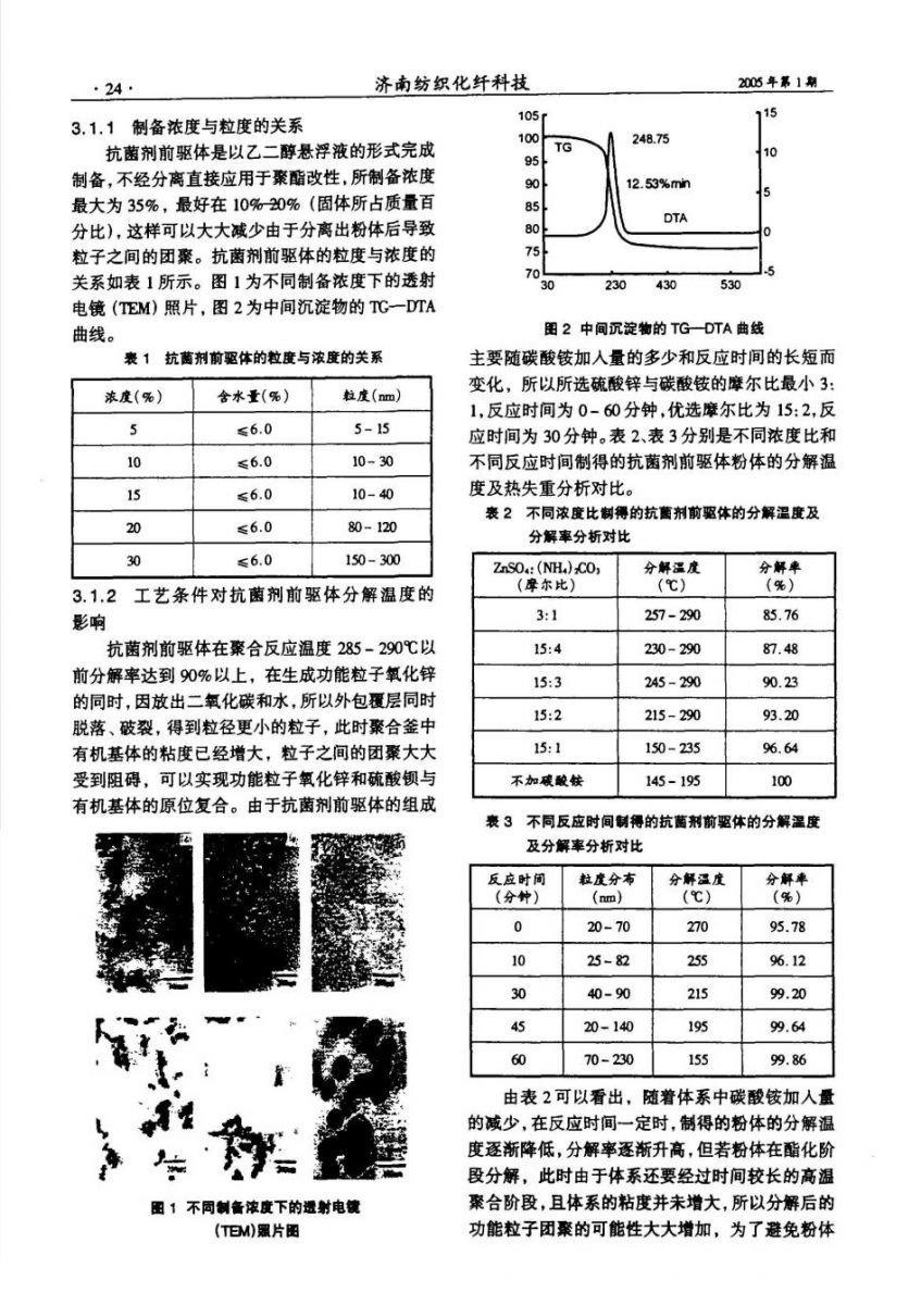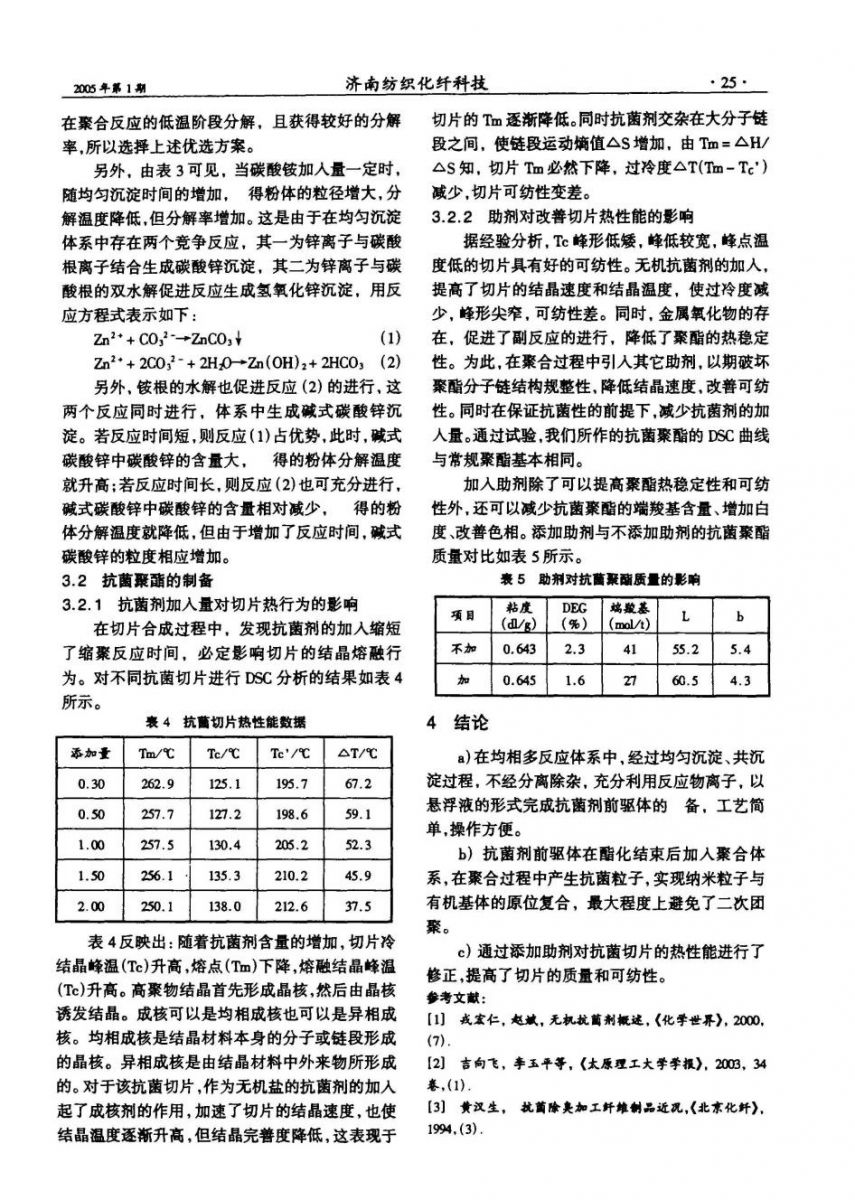 摘要:本文首先利用碳酸銨與硫酸鋅制備功能粒子氧化鋅的前驅(qū)體某種堿式碳酸鋅。隨后加入氫氧化鋇的乙二醇溶液,在均相多反應體系中生成一種復合納米材料的懸浮液,不經(jīng)分離直接加入到聚酯(腫)聚合反應體系中,在縮聚溫度(285℃左右)堿式碳酸鋅分解,生成納米氧化鋅、二氧化碳和水。同時其外包覆層破裂,得到納米硫酸鋇,實現(xiàn)無機微粒子與有機基體的原位復合,這樣制得的抗茵聚酯切片,氧化鋅粒徑小,分布均勻,而且穩(wěn)定性好,不易團聚。